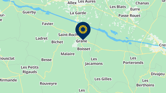 From highway A7, take exit number 16 'Loriol' direction Crest on the D104 and follow Grane-Centre at the roundabout and follow the roadsigns for the camping