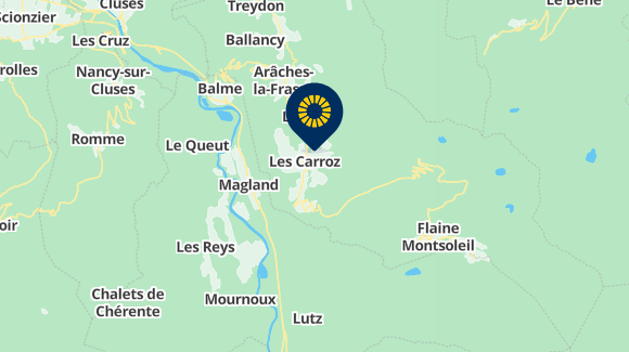 routeA40 motorway – Geneva / Chamonix Exit Cluses N°19 (13km) - take the N205 towards Sallanches, leave the N205 after approximately 3 km at the junction marked "Les Carroz d'Arâches", and turn left onto the Route des Carroz ( D6).