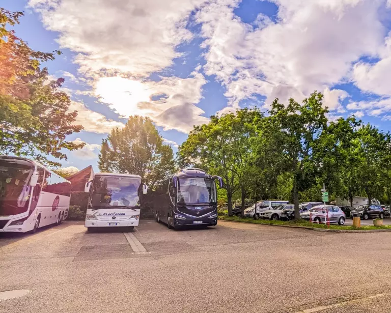 À la sortie d'Obernai, direction Mont Sainte-Odile / Ottrot. Gare Obernai à 2 km. Navette payante "Pass O" ville "ligne A" ; arrêt Camping ; sauf le dimanche. Gare Strasbourg à 27 km puis TER ou bus pour la gare d'Obernai.
